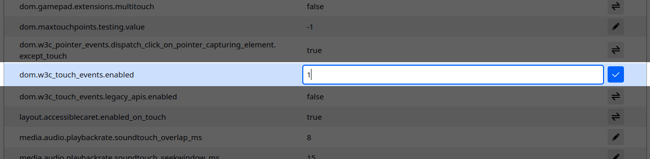 Just click on Accept the Risk and Continue, and then search/filter for touch (this will make it a bit easier to find the one we actually need to alter). Then search for (not by typing but just in the list) for: dom.w3c_touch_events.enabled (which if you’re following this tutorial, you can also just paste in the search/filter bar though of course 😉). And change the value from 2 to 1 (as shown below):