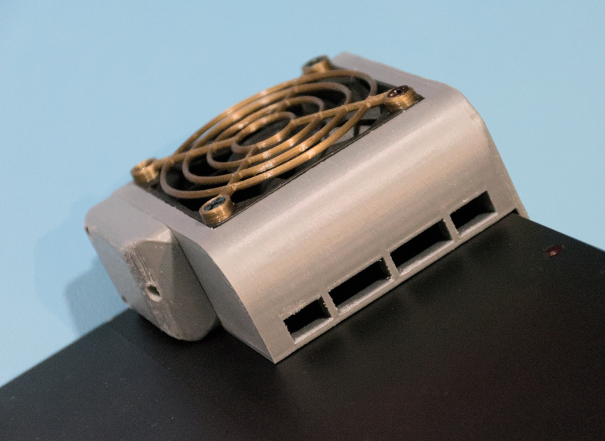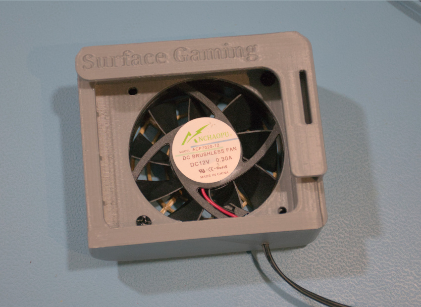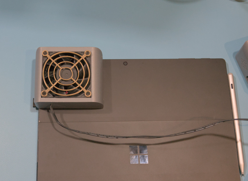 So instead of relying on (unreliable) software solutions and/or basically crippling my device while doing so, I decided to come up with a (in my opinion) better plan: Cool the surface externally. However it is obviously not really doable to ‘haul-around’ a big tabletop-fan or a (bunch of) random 120mm fan(s) to cool down your Surface wherever you go. So I decided to design a 3D model which can be easily printed and requires minimal assembly, which you can easily ‘snap-onto’ your Surface whenever you needed it.